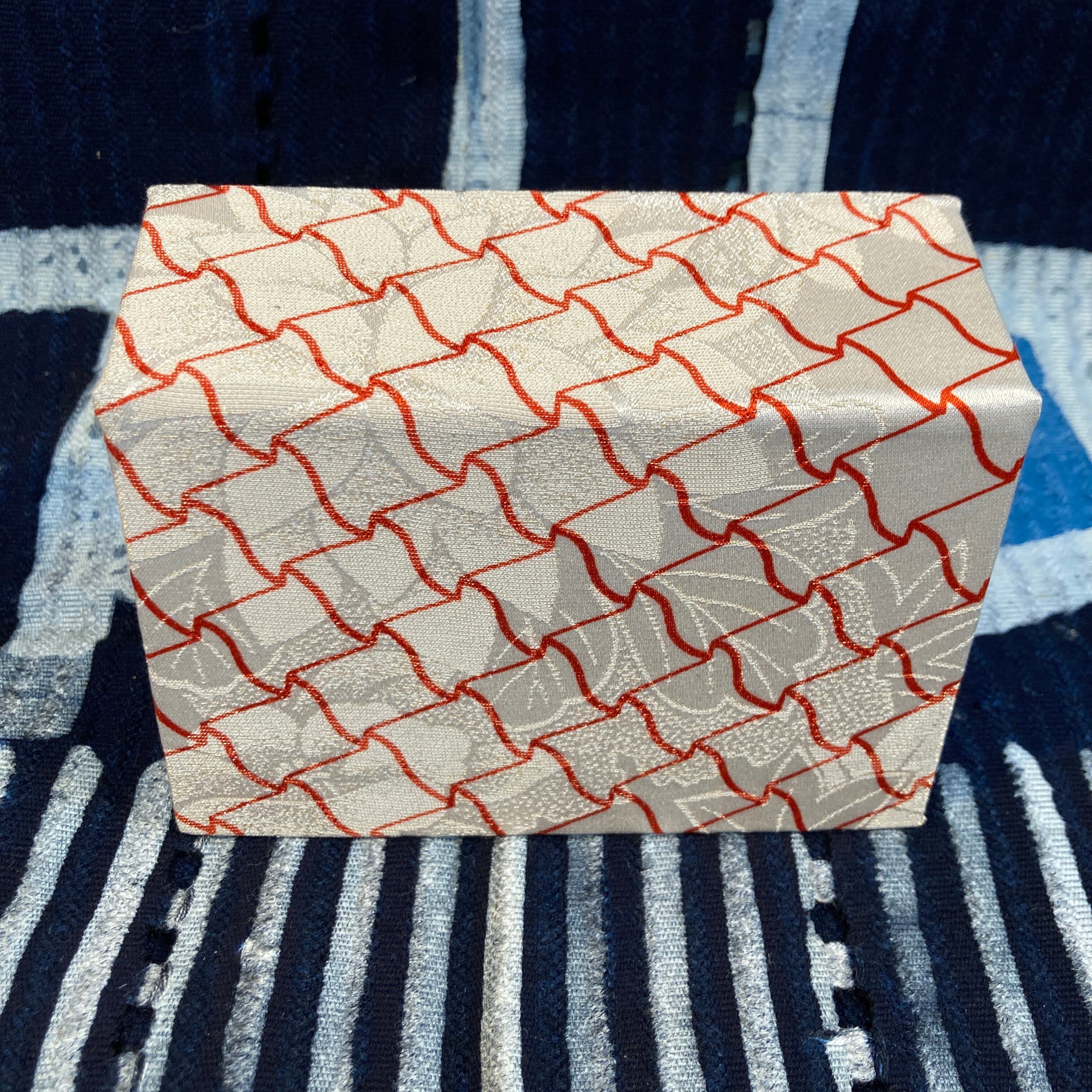 白の地模様に四季折々の花たちと、パリッと赤の模様が「雪と鶴」を連想させます。
